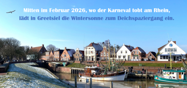 Mitten im Februar 2026, wo der Karneval tobt am Rhein, lädt in Greetsiel die Wintersonne zum Deichspaziergang ein.